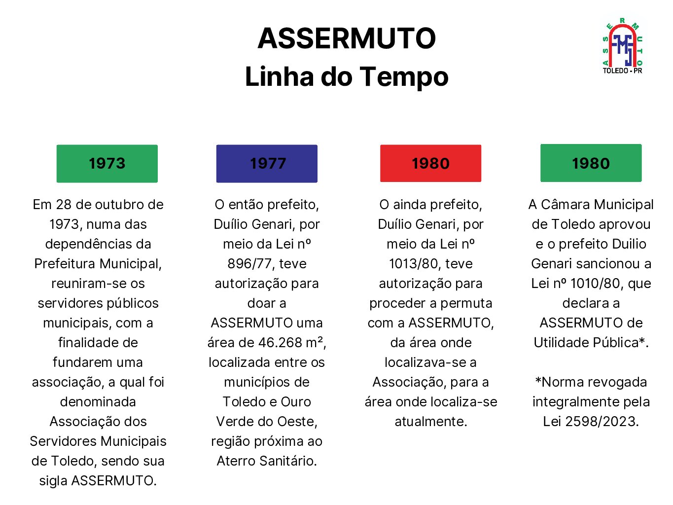 Fundada há 50 anos, a ASSERMUTO tem o objetivo de atender aos interesses coletivos dos servidores públicos municipais de Toledo/PR, atuando de forma a proporcionar benefícios à classe, gerar oportunidades comerciais em diversas frentes do mercado com o melhor custo-benefício possível aos seus associados, atendendo assim às suas necessidades de forma prática e segura, com convênios e parcerias nas mais diversas áreas, como saúde e cultura.